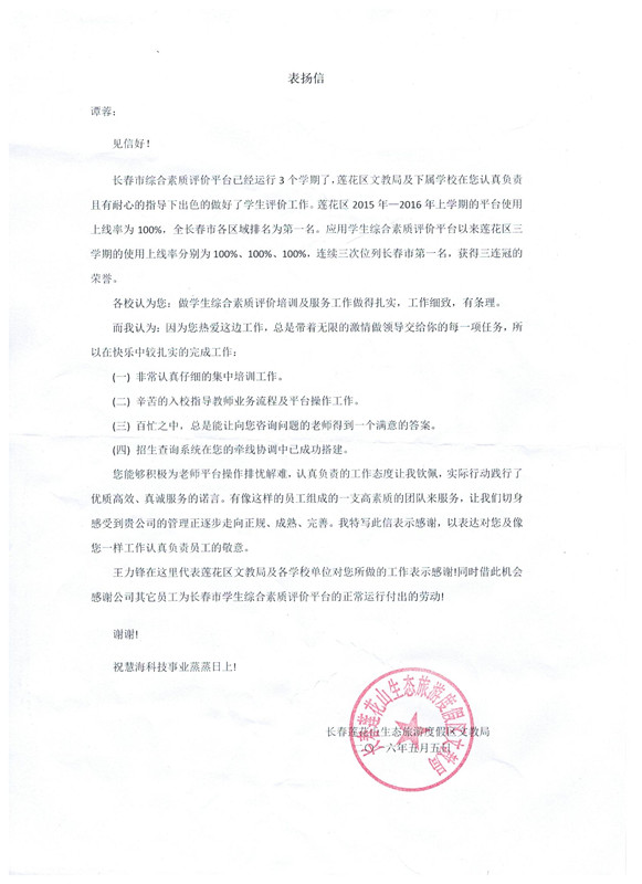 長春蓮花山生態旅游度假區文教局在給譚蓉的感謝信中表示,在使用學生綜合素質評價平臺3個學期以來,蓮花區文教局及下屬學校在其指導下出色的做好了學生評價工作,蓮花區2015年—2016年上學期的綜合素質評價平臺使用上線率100%,全長春市各區域排名第一。應用學生綜合素質評價平臺以來,蓮花區在使用上線率上連續三次位列長春市第一名,獲得三連冠的榮譽。