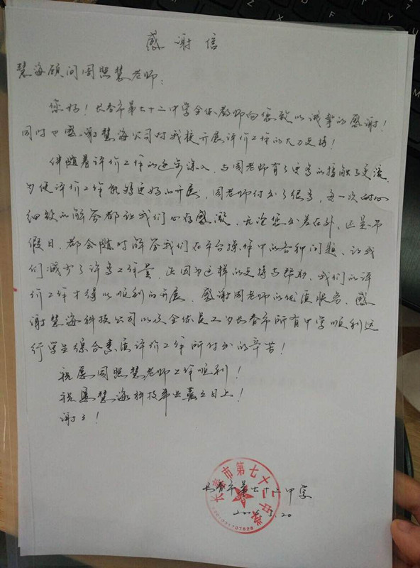長春市第七十二中學感謝慧海科技全體員工為長春所有中學順利運行學生綜合素質評價工作所付出的辛苦。