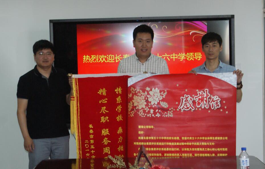 進(jìn)入驕陽似火的七月,我公司再傳喜訊。7月13日,長春市第五十六中學(xué)副校長柳鑫代表學(xué)校來到慧??萍迹瑢3虒⒏兄x信與錦旗送到我公司,特別向我公司實施部員工宋凱對五十六中學(xué)素質(zhì)教育綜合評價系統(tǒng)運行和快速發(fā)展過程中給予的幫助和支持表示感謝。